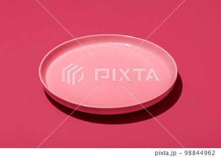Top view of isolated of colored background empty round pink plate for food. Empty dish with space for your design