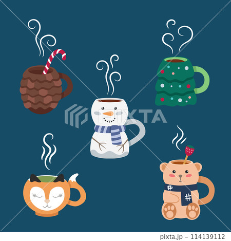 Cute winter mugs with hot drinks in the shape of snowman, fox, Christmas tree, pine cone, bear toy. Beautiful set of illustrations on blue background.