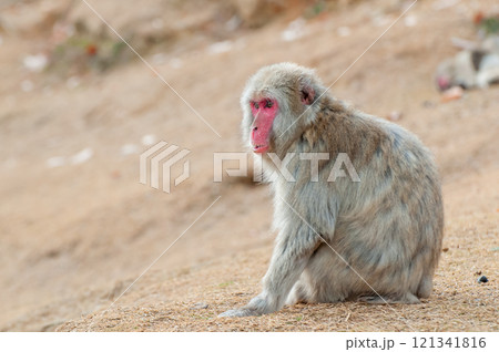 池の傍にすわるニホンザル 嵐山モンキーパークいわたやま