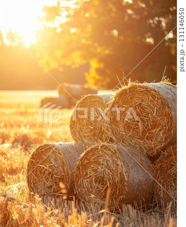 Warm Golden Sunlight on Stacked Hay Bales in a Rural Field During Harvest Season