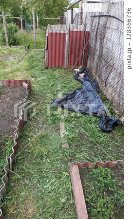 An overgrown garden with torn fencing and an old black tarpaulin covering some areas