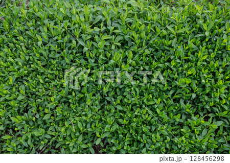 Common knotgrass covers the ground with lush greenery forming a low-growing herbaceous layer in a garden setting during sunny spring days
