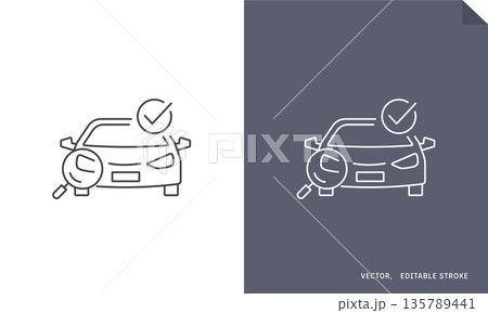 車検、自動車整備、売却査定のベクター線画アイコン。車と虫眼鏡とチェックマーク。