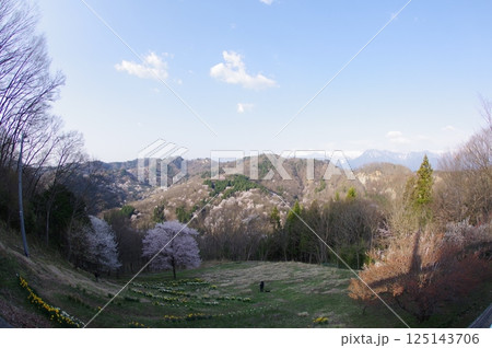 夢農場の桜と北アルプス