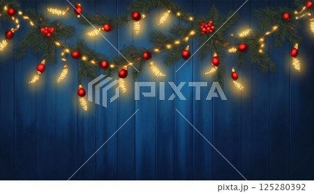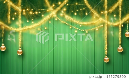 Christmas decorations and gifts and garland on a wall background for new year celebrations, winter fairy tale