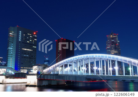 都市夜景 東京 ライトアップされた勝鬨橋と隅田川