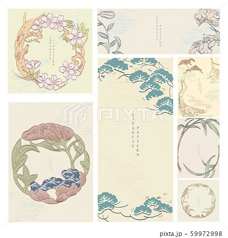 Japanese template with grunge texture. Flower, pine tree, bonsai, bamboo and lilly and wave elements. Layout design.