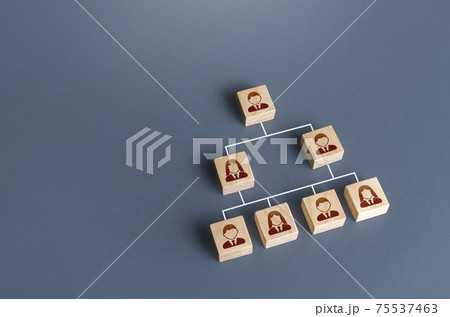 Blocks of people connected by lines form a pyramid hierarchical system. Personnel management, delegation of responsibilities, leader regulatory functions. Competition, striving for career growth