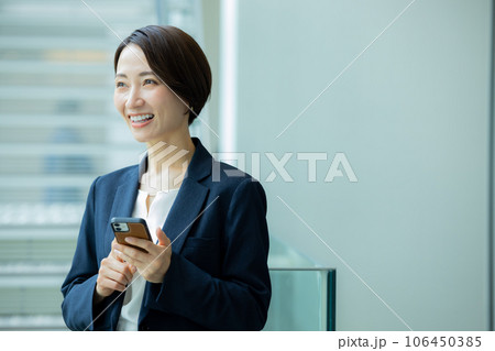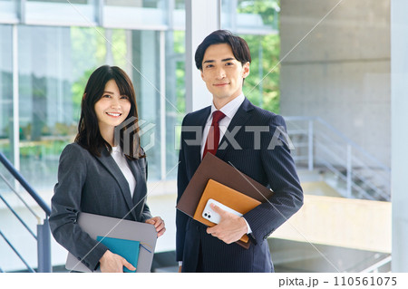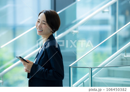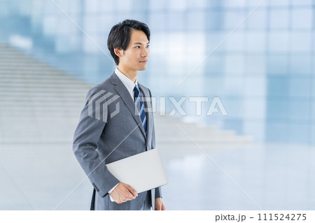 オフィスのエントランスにバソコンを持って立つ若いスーツ姿のビジネスウーマン