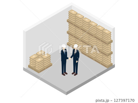 米不足対策の備蓄倉庫と契約の様子のアイソメトリックイラスト