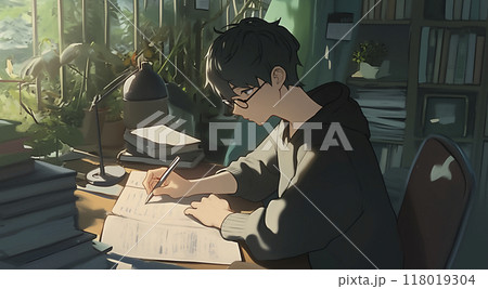 かわいい少女まんが風・レポートを作成する女学生のイラスト