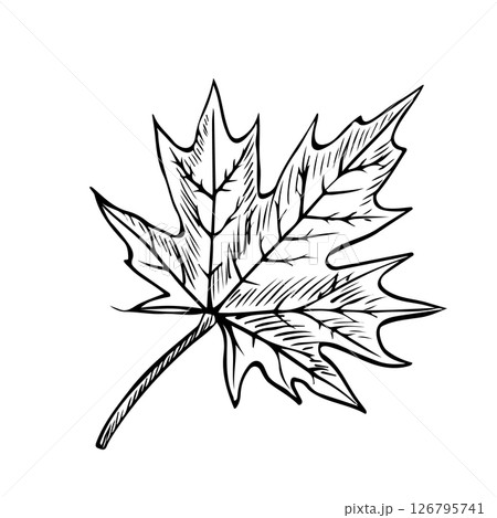 The maple leaf. Vector graphics. Black and white hand-drawn illustration. On a white background. Great for stickers, banners, posters and packaging, postcards, flyers, labels and prints.