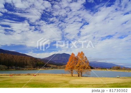 初冬の飯綱町霊仙寺湖 黒姫山と白い雲と際立つ黄葉