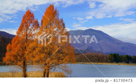 晩秋の飯綱町霊仙寺湖 黒姫山と白い雲と際立つ黄葉