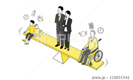 育児と介護と仕事の両立、ダブルケアのイメージイラスト、ベクター
