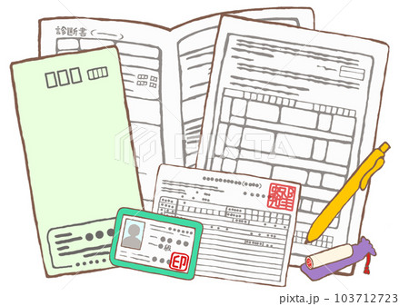 精神通院医療の自立支援医療の申請書と精神障害者手帳と収入証明書と受給者証と印鑑のイラスト