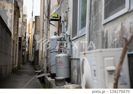 昭和の面影を残す住宅街の細い路地とプロパンガス