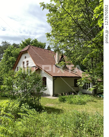 White cottage in lush green garden under bright sky, surrounded by trees, suitable for backgrounds