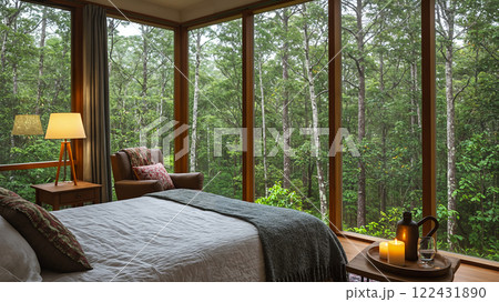 森の中に建つコテージホテル、ガラス張りのベッドルームからの眺めはまるで森の中にいるかのような気分に。