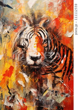 Metaphorical associative card on theme of animal. Tiger on yellow background. In style of impressionism and oil painting. Psychological abstract picture. Postcard, wall decoration, book illustration.