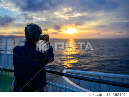フェリーから見る夕焼けと海