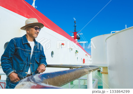 晴天のフェリーデッキで景色を眺める中高年男