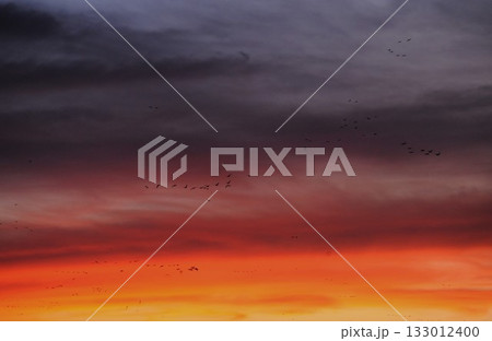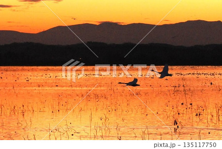 オレンジ色に染まる夕焼けの宮城県蕪栗沼で見られるガンのねぐら入り