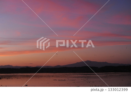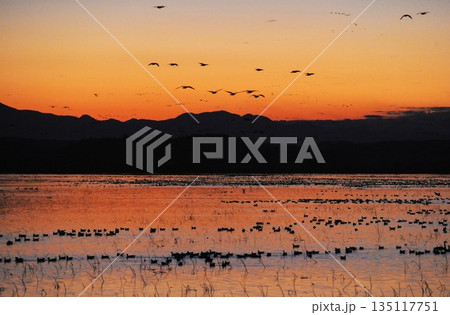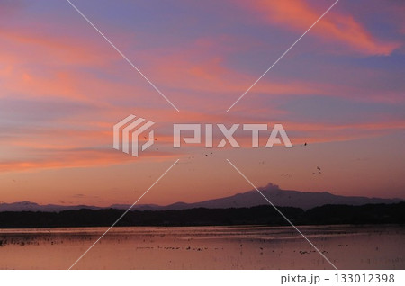 豆沼を飛び立つ渡り鳥と朝焼けの空