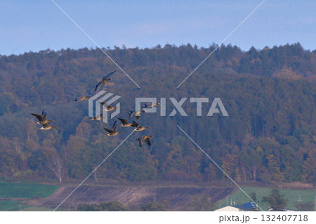 北国の冬の渡り鳥、青空の下で飛ぶマガンの群れ