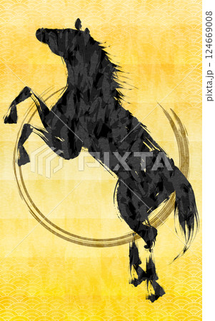 2026年午年の年賀状素材、立ち上がる馬と金色の和風背景