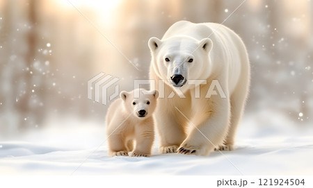 Polar bear with two cubs walking across snowy terrain, gentle bond in cold wilderness, 3D rendering