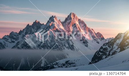 Snow Capped Mountain Range Lit By Warm Sunset Light With Wispy Cloud Accenting Alpine Landscape