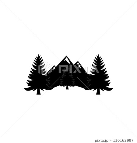 A minimalist black silhouette design features mountain range flanked by pine trees, evoking sense of adventure and nature. simple yet striking composition captures essence of wilderness