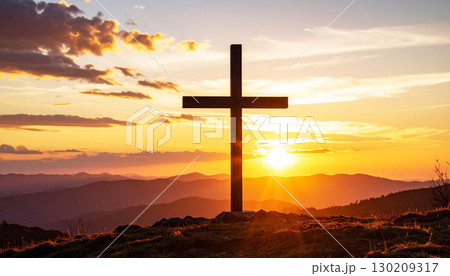 Silhouette of a wooden cross on a hilltop with golden sunset and glowing rays, symbolizing faith, hope, sacrifice, and spiritual peace in a dramatic natural landscape, cross on sunset