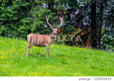 Red deer (Cervus elaphus hippelaphus) standing on a lush, blooming meadow. Behind it, a dense forest creates a picturesque natural backdrop. A symbol of wild beauty