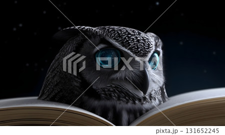 Owl with galaxy eyes perched on open book, wisdom cosmic theme
