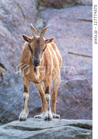 Markhor female on the rock. Latin name - Capra falconeri. Wild goat native to Central Asia, Karakoram and the Himalayas