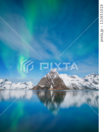 Aurora Borealis in Scandinavia. Norway, Lofoten islands. Northern lights over the mountains.