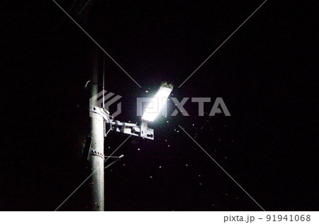 電柱に設置されたライトに多数の虫が群がっている夏の夜間の屋外の光景を高感度で撮影した画像