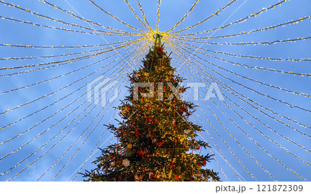 Festive Christmas tree adorned with colorful lights and decorations against a clear blue sky in winter season