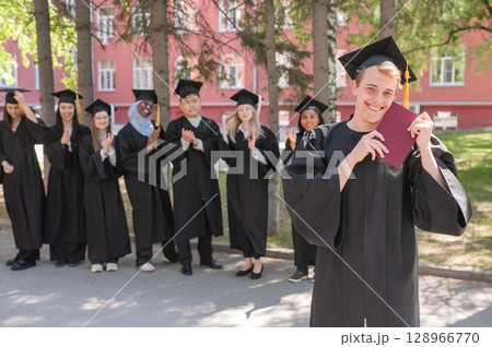 Happy international students celebrating graduation from university or college, holding diplomas and graduation hats, jumping up, laughing and posing at camera, campus background
