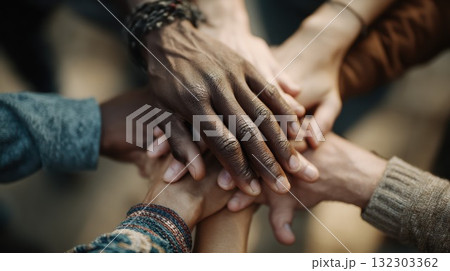 Diverse group places hands together in unity gesture showing teamwork and community support concept