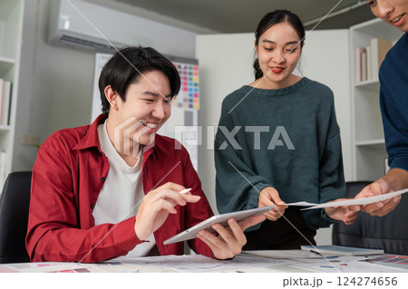 Photo studio work. Creative team. Positive people brainstorming project. Colleagues review discuss results professional shooting production.