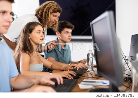 Positive skilled male coach explaining topic to group of people during foreign language class in auditory