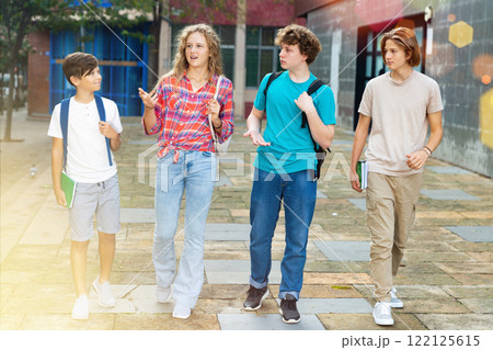 Happy students walking together on university campus, chatting and laughing outdoors after classes