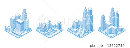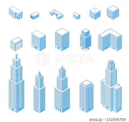 Isometric line buildings. Various apartments and building with windows. Isolated outline urban architecture, office shopping mall, nifty vector set