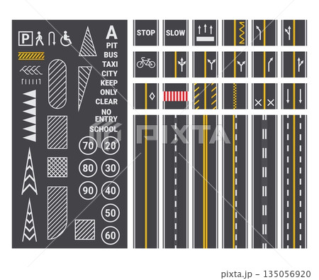 Road marking. Asphalt surface marks top view, city traffic street road markings highway lanes strip line crosswalk bus stop sign cartoon roadway mark kit kicky vector illustration