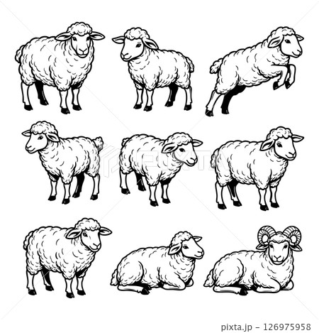 Vector set of sheep in multiple poses standing, grazing, jumping, and lying down. Great for farm graphics, mascots, logos, or children illustrations. Farm animals.