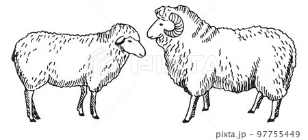 Sheep sketch style. Hand drawn illustration of beautiful black and white animal. Line art drawing in vintage style. Realistic image.