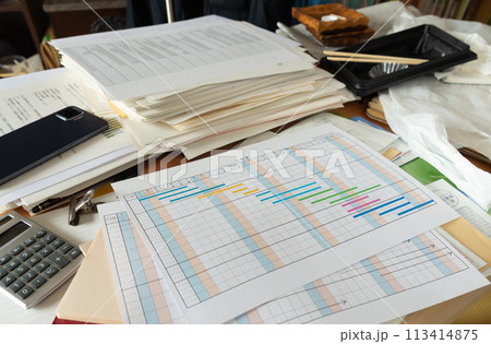 溜まった書類や郵便物で雑然とした机 散らかった机 散乱
